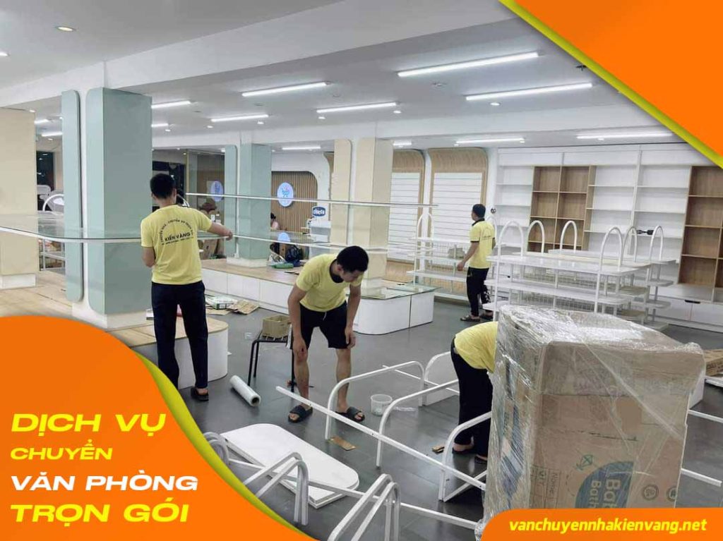 - Tháo dỡ tủ, kệ, bàn làm việc.. Và tiến hành bọc lót và đóng gói bằng thùng carton và màng bọc PE để đảm bảo an toàn.